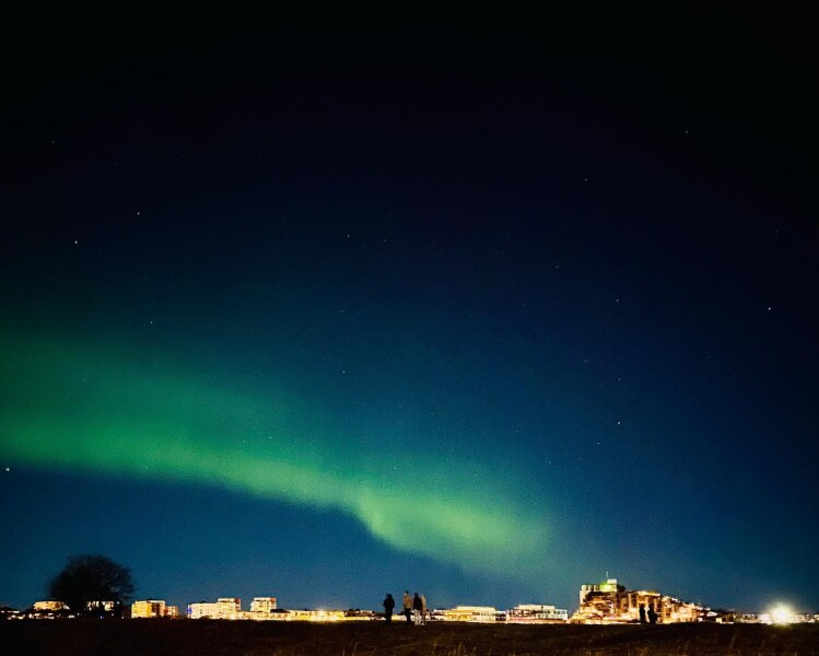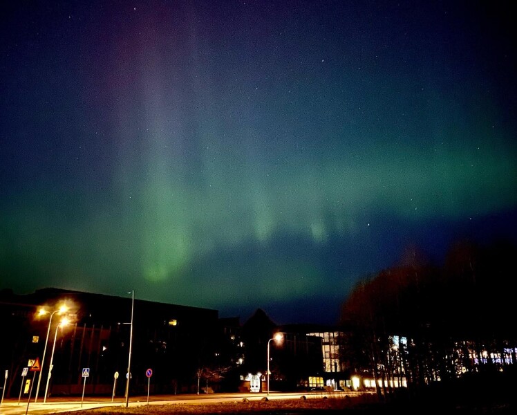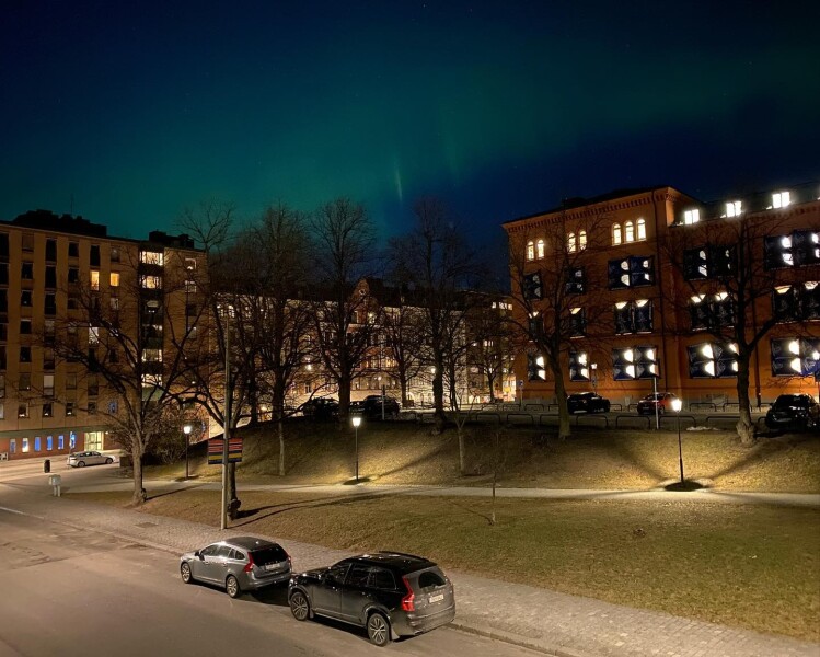 It had to be a mistake, or maybe a lame joke. I looked through the window and couldn't really see anything, it was just a normal chilly evening, street lights in full glow, dark blue skies. When I told Maja she had the same reaction - not probable. It probably wasn't, but I really wanted it to be true. So I opened the door to our balcony, letting the cold air into the room, and stepped out wearing just a t-shirt. The sky looked different. "I think I can see it" - I said to Maja. It was extremely faint, a slight change of shade from blue to green, but I was sure I could see it. Then I had an idea. If Aurora was really there, I should be able to point my phone's camera to see it better. Phone cameras nowadays are programmed to use every possible trick to create great photos at night - multiple and long exposures, contrast adjustments, machine learning. Just opening the camera app and pointing the lens at the sky was enough. Aurora came to our front yard.